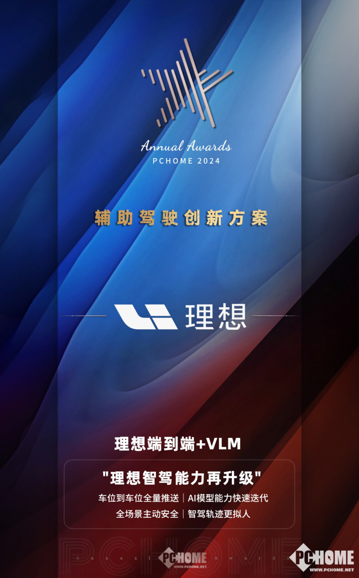 在PChome2024年度科技产品评选活动中,理想端到端+VLM荣获年度辅助驾驶创新方案。