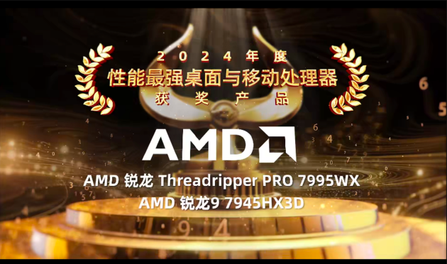 盛典现场首先揭晓的是电脑榜的悬念。2024年最强CPU之争,桂冠毫无悬念地落在了AMD的头上。桌面端的锐龙 Threadripper PRO 7995WX和移动端的锐龙9 7945HX3D,再度以其超强多核心性能、高频率、大缓存设计,定义了“性能怪兽”的新高度。这两款处理器不仅在渲染和数据处理等专业场景中无可匹敌,也成为游戏玩家和内容创作者的“绝佳拍档”。