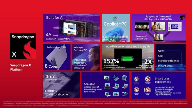据介绍,Snapdragon X采用4纳米制程工艺制造,配备高通的Oryon CPU,拥有8个核心,最高主频可达3GHz,为下一代PC提供了强大的计算性能。