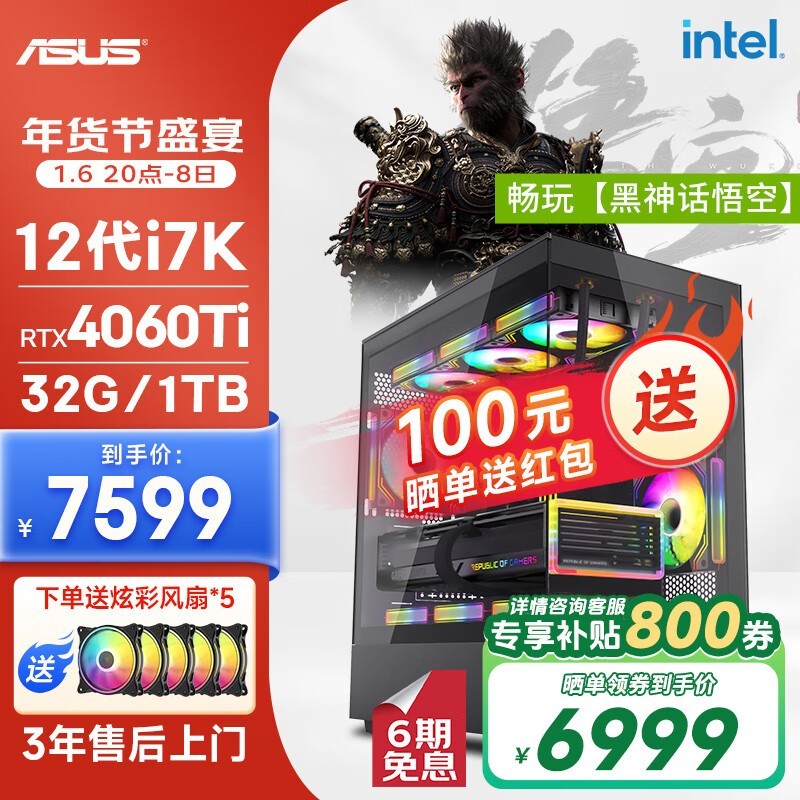 华硕全家桶电脑主机 12代i7+RTX4060Ti仅售7099元