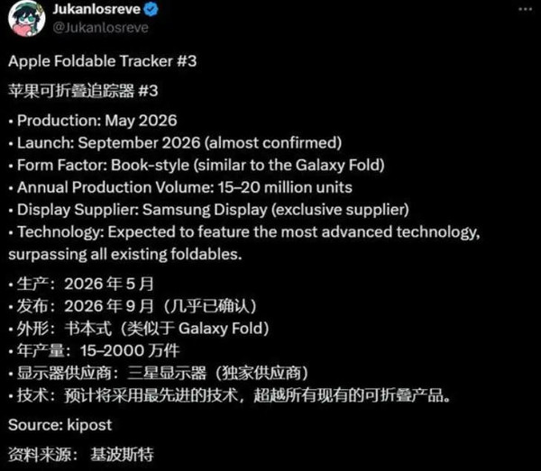此前,知名爆料人Jukanlosreve透露,苹果的首款折叠手机有望在2026年5月正式量产,并可能在今年9月与新款iPhone一同发布。这款折叠手机不仅在设计和功能上极具创新性,而且在市场销量方面也被寄予厚望。据称,苹果预计这款折叠手机的全年产量将达到1500万台至2000万台,足见其对市场的信心。