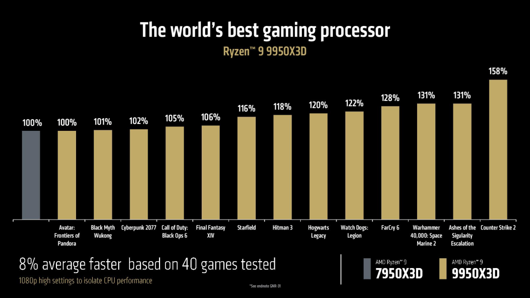 AMD 的测试结果显示,在 40 款游戏中,9950X3D 以 20%的优势击败了英特尔旗舰 Arrow Lake Core Ultra 9 285K。不过,AMD 在 9950X3D 中使用了超频的 DDR5-6000 内存,而 285K 使用了普通的 DDR5-6400,这成为了优势来源。