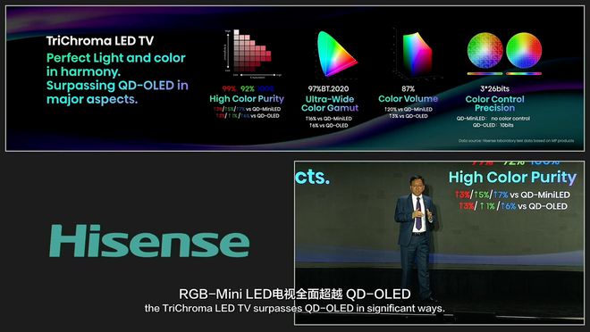 据海信官方介绍,RGB 三维控色液晶显示技术,在色彩纯度、色域面积、色彩体积、控色精度等几个维度都实现了对量子点技术的超越,全面超越 QD-OLED,推动液晶电视从黑白单色背光控制正式进入 RGB 多基色背光控制显示时代。