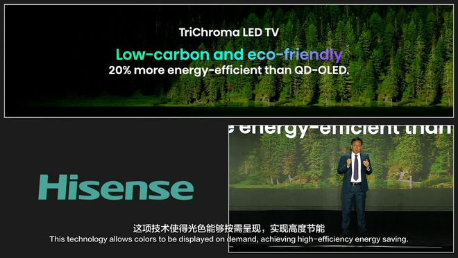 海信 RGB 三维控色液晶显示技术在控色也具有显著优势,光源控色精度高达 3*26bits。不仅如此,海信 RGB-Mini LED 电视还较 QD-OLED 电视及传统 Mini LED 节能 20% 以上。