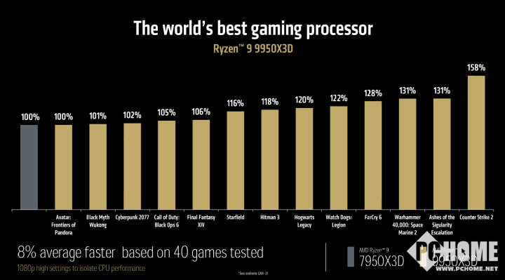 而在性能对比方面,在40款游戏性能对比当中,锐龙9 9950X3D平均比锐龙9 7950X3D性能高出8%左右。但受到3D V-Cache的特性影响,在不同游戏当中的性能提升差异很大,在部分大作当中性能提升十分有限,但在如《CS2》等网游当中帧数最高可提升58%。