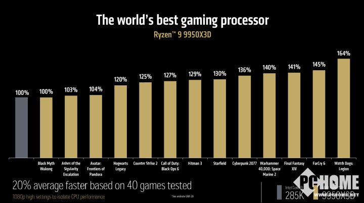 而在与英特尔酷睿Ultra 9 285K的游戏性能对比当中,锐龙9 9950X3D则是平均领先20%,领先最多的是《看门狗:军团》,幅度达到64%之多。但结合此前锐龙7 9800X3D对比Ultra 9 285K同样平均领先20%的游戏表现来看,锐龙9 9950X3D和锐龙7 9800X3D在游戏性能上的表现应该是十分接近的。