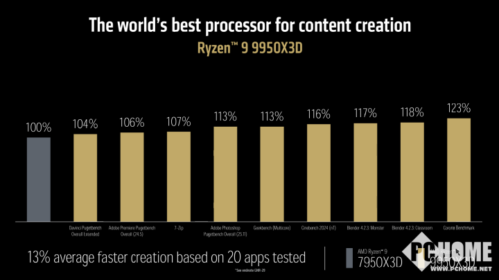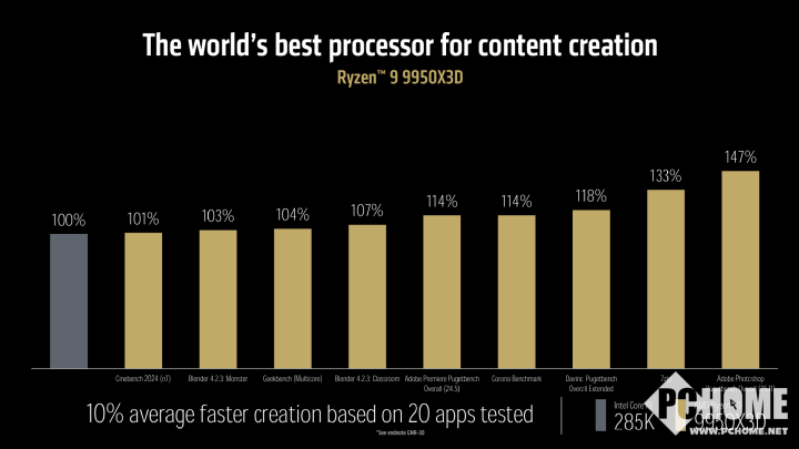 而在生产力方面看,锐龙9 9950X3D在20个内容创作应用当中对比锐龙9 7950X3D平均提升了13%,对比酷睿Ultra 9 285K则领先10%左右。可以说无论是在游戏性能上还是生产力性能上,锐龙9 9950X3D都领先于上代自家旗舰以及对手当代旗舰,表现相当出色。