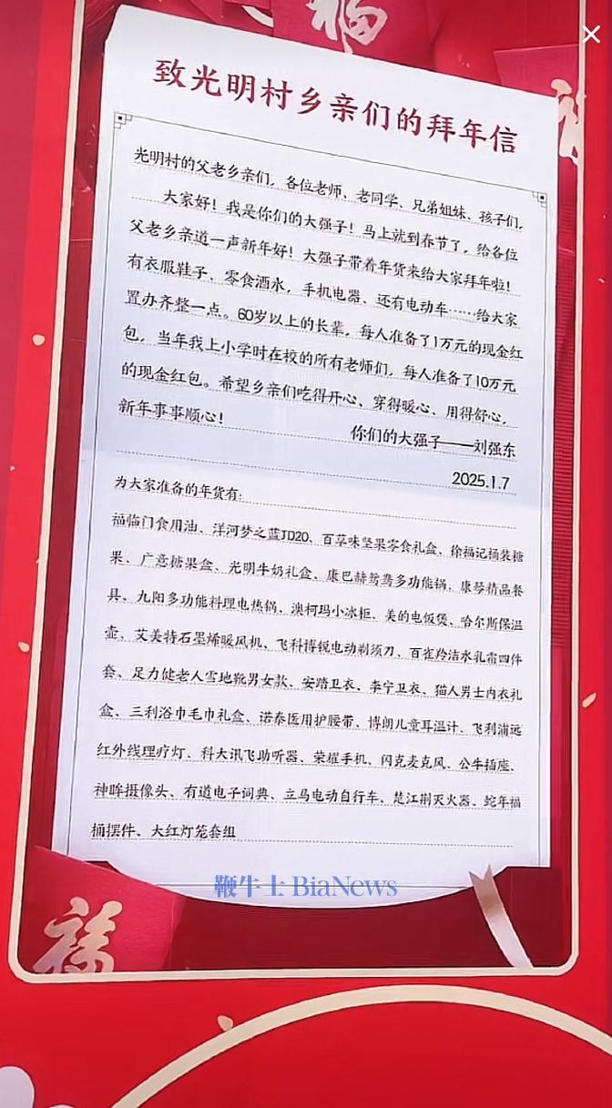 鞭牛士 1月7日消息,刘强东今日给老家乡亲写了一封拜年信中,他在信中称自己为“大强子”,并承诺为自己在光明村读小学时所有在校老师每人准备了10万元的现金红包。