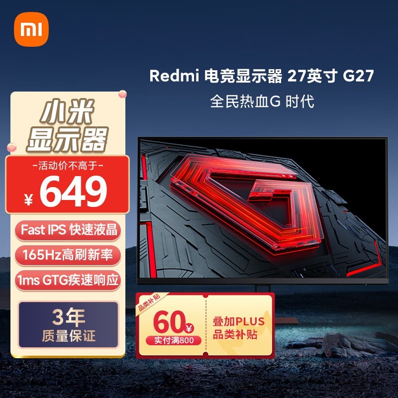 小米Redmi G27电竞显示器优惠仅625元 游戏党必备