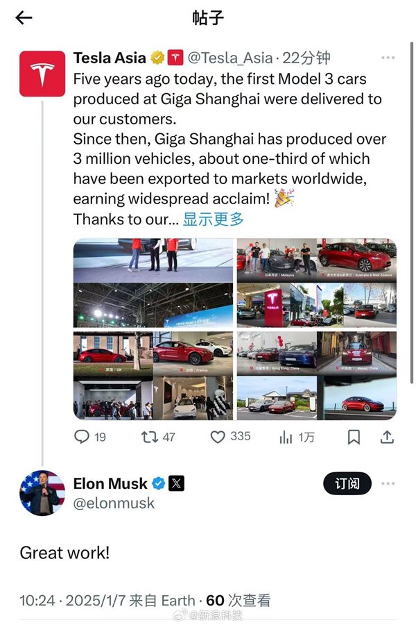 快科技1月7日消息,特斯拉官方发文称,五年前的今天,上海超级工厂生产的首批Model 3正式交付。