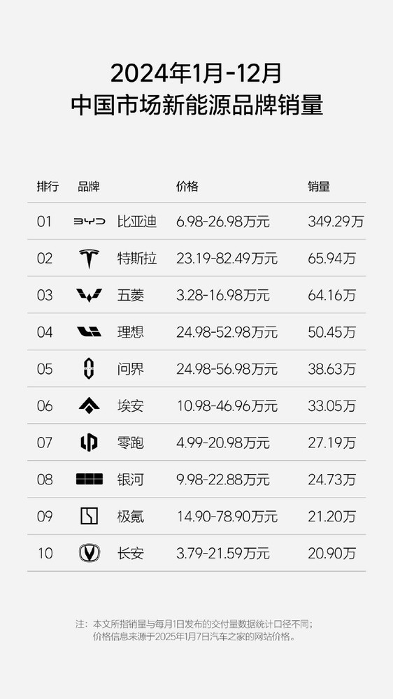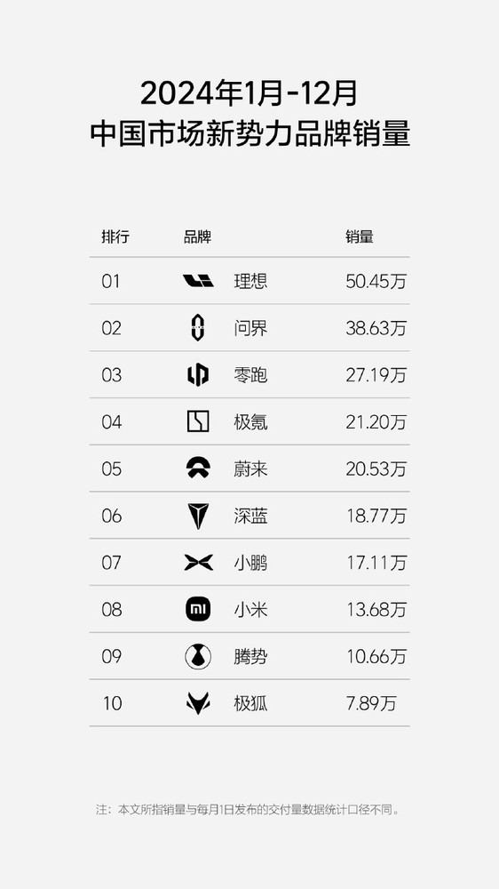 2024新势力总销量榜公布 理想第一问界第二 小米进前十