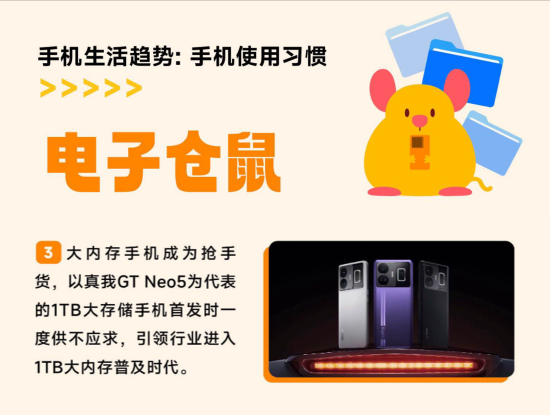 报告中,还有不少关键词值得关注,真我手机作为更懂年轻人的科技产品也在其中频频出镜。如“电子仓鼠”一词点出手机已然成为年轻人的记忆存储站,是即时记录的核心载体,他们像仓鼠一样囤积各种文件、照片和视频,堆叠着人生的时时刻刻、方方面面,即便内存紧张也舍不得删除。因此,大内存手机自然成为抢手货,以真我GT Neo5为代表的1TB版本手机在首发时一度供不应求,引领行业进入1TB大内存普及时代。