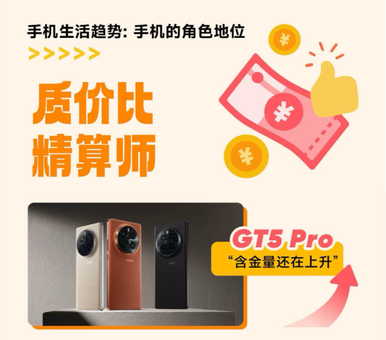 “质价比精算师”一词也抓住了在消费需求变化和理性回归的趋势下,年轻人在手机选购时精打细算的消费智慧,更关注手机的实际使用价值,产品力和性价比两手抓。比如真我GT5 Pro就以当时最顶级的旗舰芯、出色的续航能力、潜望长焦配置等硬实力成为消费者心中的质价比天花板,被网友称为旗舰机里的“电子茅台”。