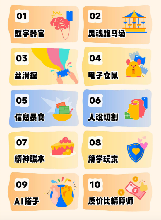 该报告基于对年轻人手机生活的细致观察和深度访谈,提炼了十个极具网感和代表性的关键词,分别为数字器官、灵魂跑马场、丝滑控、电子仓鼠、信息暴食、人设切割、精神碳水、稳学玩家、AI搭子、质价比精算师,全方面呈现当下年轻人手机生活的真实写照和流行趋势。
