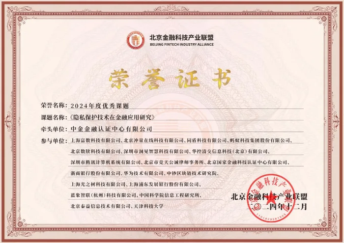 近日,北京金融科技产业联盟2024年度会员代表大会圆满召开,会上揭晓了2024年度工作考核结果。在众多亮眼成果中,由中金金融认证中心有限公司(CFCA)牵头,同盾科技、中国科学院信息工程研究所等单位共同编写的《隐私保护技术在金融应用研究——以个人金融信息保护和金融反欺诈为例》报告荣获“2024年度优秀课题”殊荣。此次获奖是对同盾科技在隐私计算领域技术创新与行业贡献的高度认可。