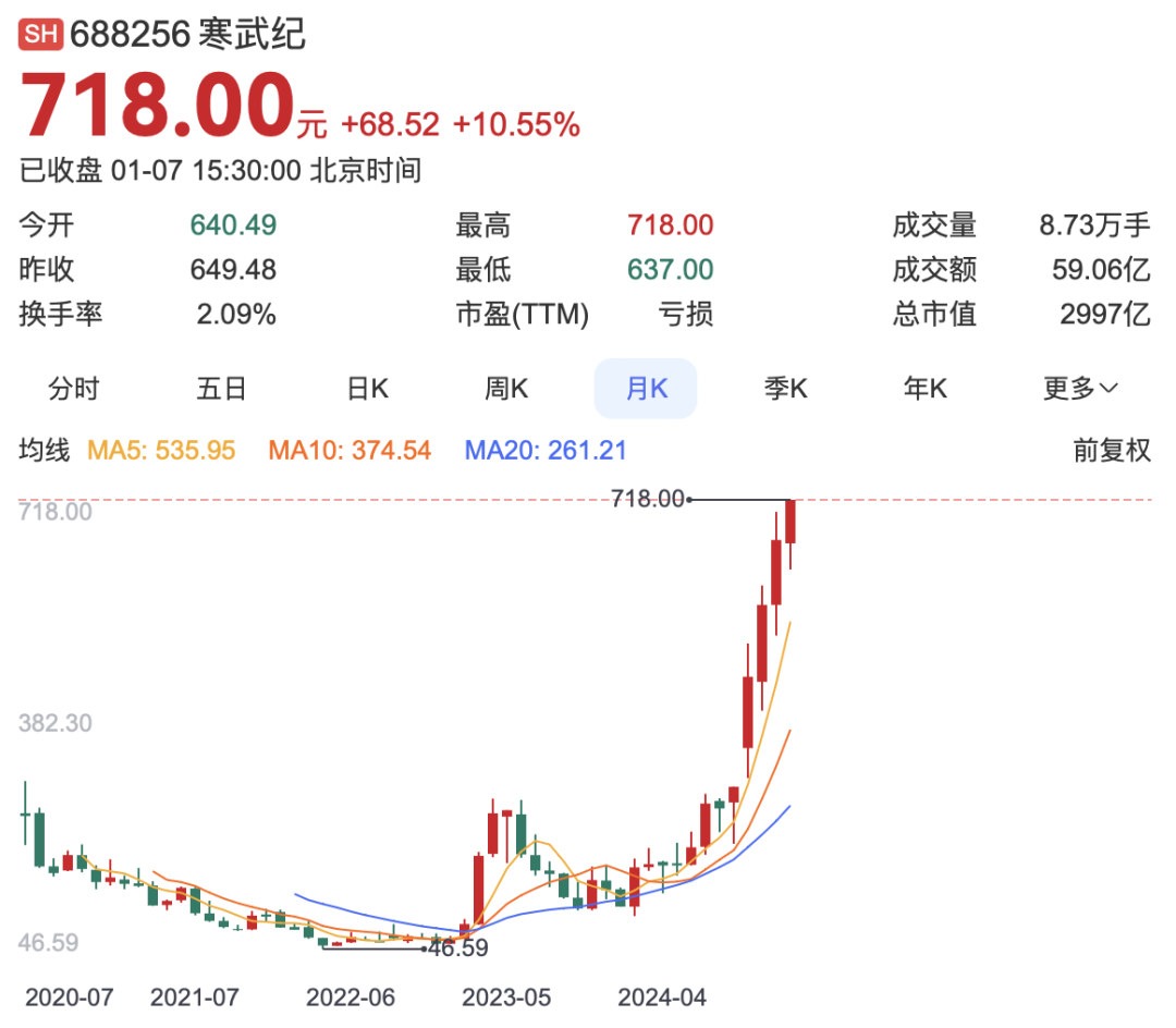 C114讯 1月7日消息(南山)今日,国产GPU供应商寒武纪股价大涨10.55%,突破700元大关,再创历史新高,市值达到2997亿元。