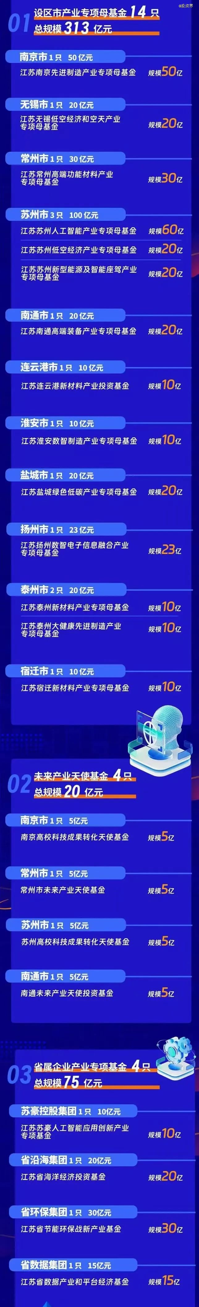 这是一场城市之间的产业竞赛。时间回到2024年6月,江苏省战略性新兴产业母基金正式落地,总规模500亿元,可以说是江苏省引导基金史无前例的重大规模布局。