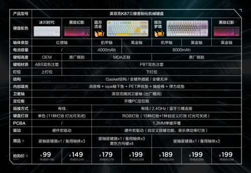 国货外设品牌英菲克再次发力,旗下K87客制化机械键盘宣布上架2款新配色:黑玫幻影与冰川时代。年货节大促活动期间,英菲克K87机械键盘仅需99元起。