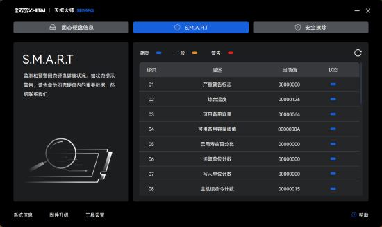 测试前,我们肯定是要确保SSD固件最新、状态良好的。这时候,长江存储致态的天枢大师固态硬盘管理软件就派上用场了。