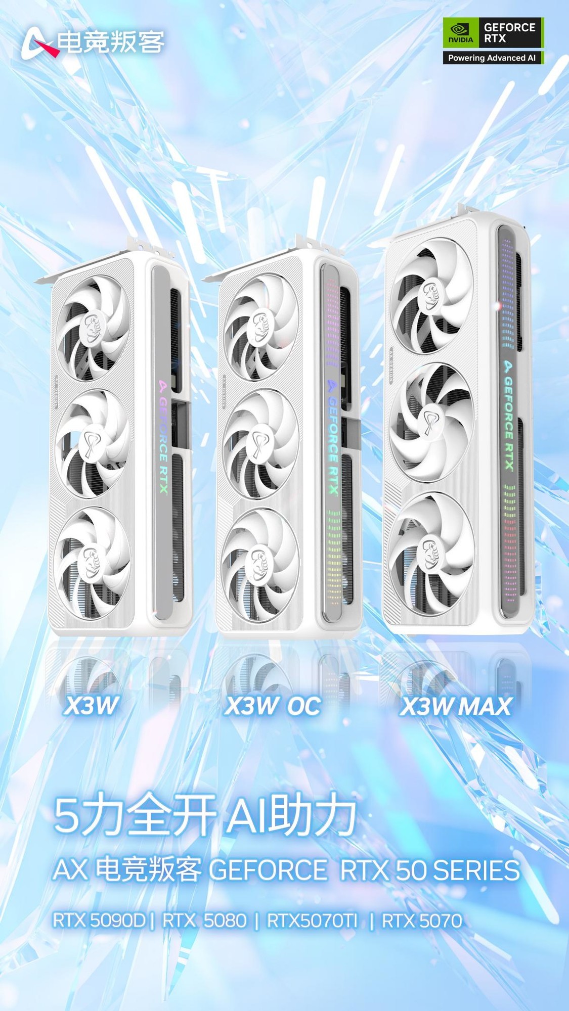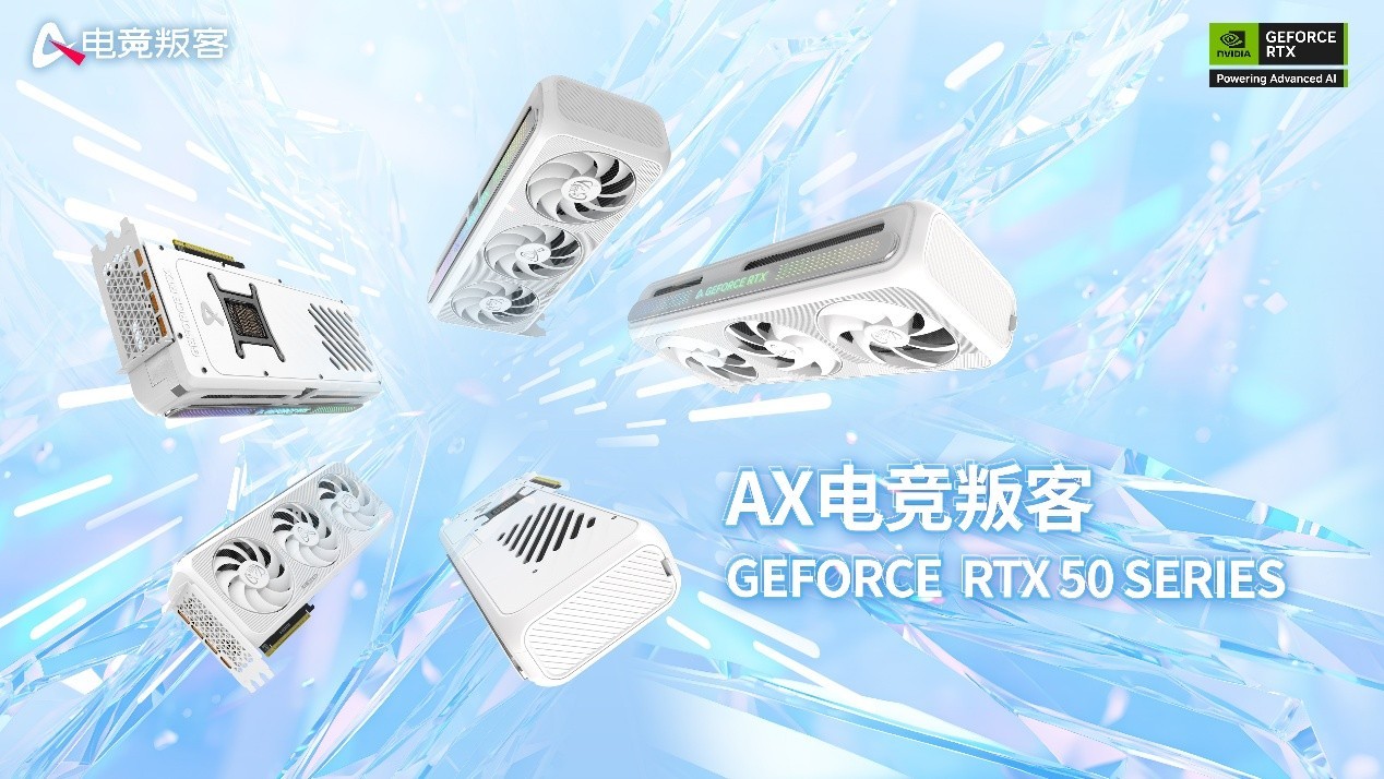 外观、性能、规格等方面的跨越式升级,让GeFoceRTX50系列显卡收获广大媒体与玩家的关注。在纯白显卡领域,AX电竞叛客独树一帜的品牌辨识度一直以来深受玩家们的推崇,独特的纯白设计和丰富的可玩性造就了次世代电竞玩家们桌上一个个鲜活的案例。随着GeForceRTX 50系列正式发布,AX电竞叛客各类产品也将陆续登陆市场与玩家们见面。