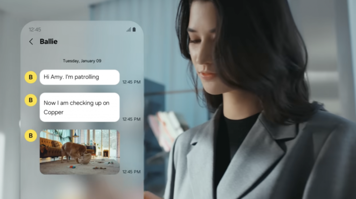 在三星的概念宣传片中,远在办公室的用户能够用手机问 Ballie 自己的狗狗在做什么,Ballie 就会自己找到狗狗拍照和录像,自动发给用户。