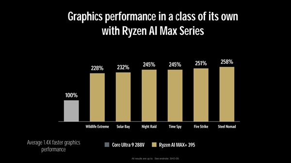 性能方面,参考锐龙AI MAX+395与酷睿Ultra 9 288V的测试对比,前者在3D渲染性能方面平均比后者高出2.6倍;图形性能平均高出1.4倍。
