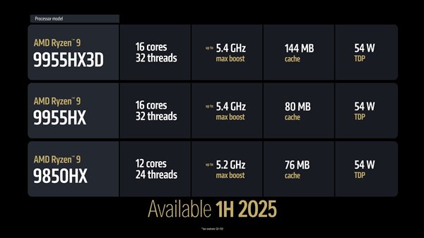 其次是移动级平台,AMD这次带来了锐龙9 9955HX3D、锐龙9 9955HX以及锐龙9 9850HX三款顶级新品。