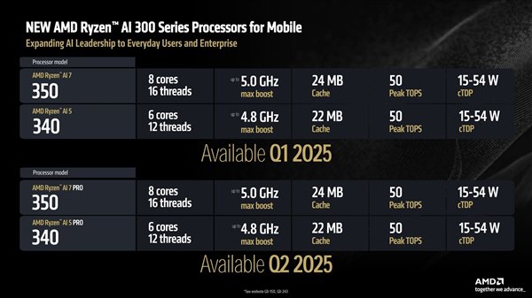 锐龙AI PRO 300系列也带来了两款新品:锐龙AI 7 PRO 350和锐龙AI 5 PRO 340,总体规格与锐龙AI 300系列两款新品相同,但是支持锐龙PRO的所有特性,对于商务用户而言更为合适。