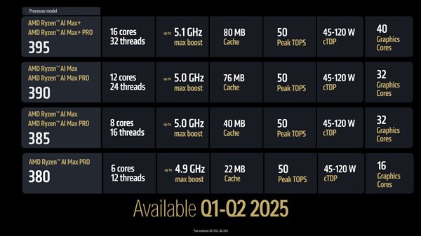 全新的锐龙AI MAX+系列包含锐龙AI MAX+ 395核锐龙AI MAX+ PRO 395,均采用16核32线程设计,加速频率5.1GHz,总缓存高达80MB,峰值AI算力为50TOPS,cTDP为45-120W,集成40个图形核心。