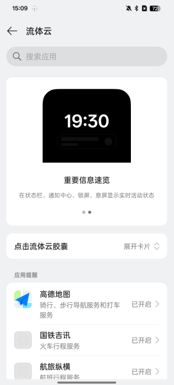 接着该“流体云”同样具备丝滑流畅的动效,点击流体云胶囊后,凡是支持流体云的应用服务均会展开一张卡片,并且依次排列在挖孔下面,不会对通知栏的图标、信息进行遮挡,流体云展开、缩小过程的弹出、收回的动效用Q弹来形容再好不过了,同时左右滑动切换流体云内的APP服务,Q弹的动效同样行云流水。“流体云”卡片信息浓缩且完整,动效Q弹且富有生命感,因此它并非一只花瓶,也并非为了上岛而上岛。