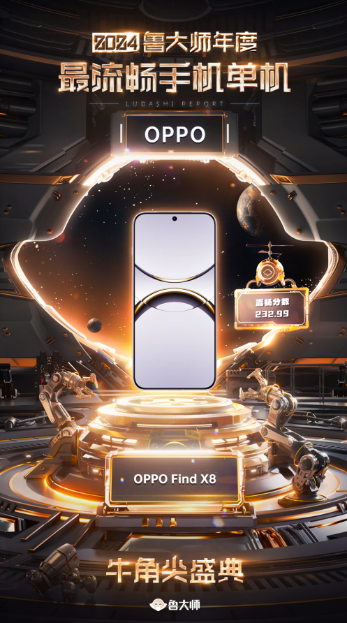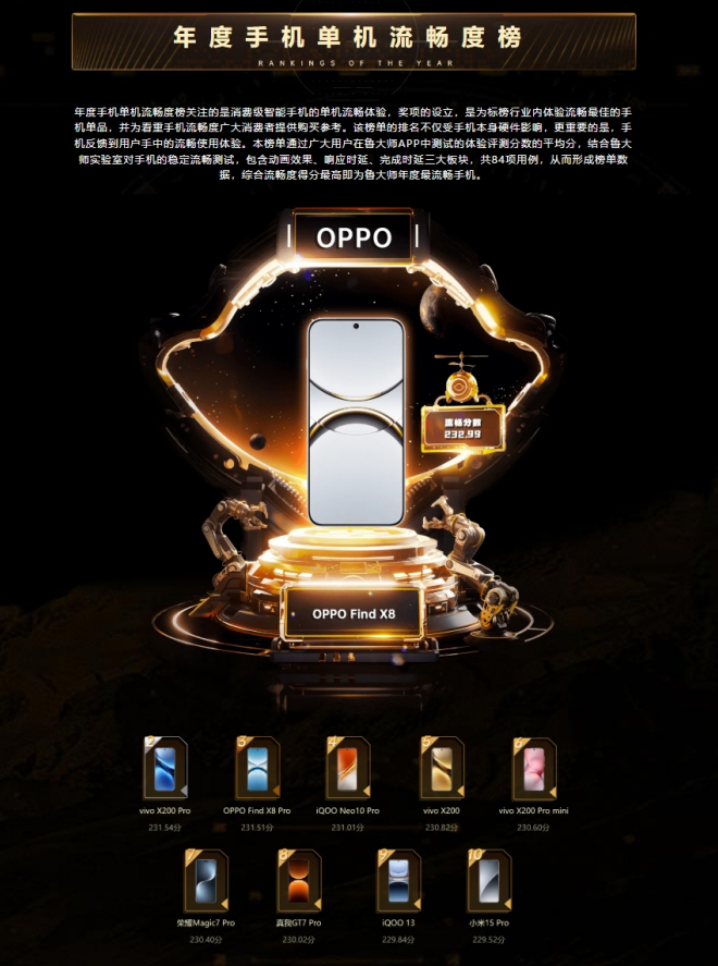 再结合该机型用户在鲁大师APP体验评测中所跑出的平均分215.8,汇总出Find X8流畅总分为232.99,成功豪取鲁大师“2024年度流畅度手机单机榜”冠军。