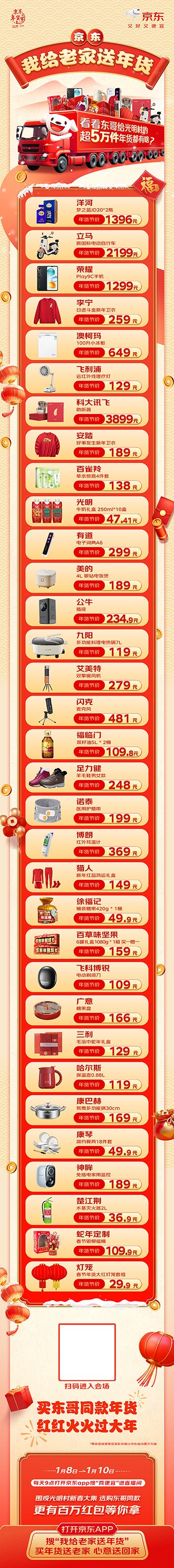 想要一键获取东哥同款年货的朋友还可以锁定京东直播,1月8日-10日每天9点,打开京东APP搜索“真便宜”,进入“京东真便宜采销直播间”围观光明村新春大集,即可轻松选购“东哥”同款年货商品,更有百万红包等你拿,买东哥同款,红红火火过大年!