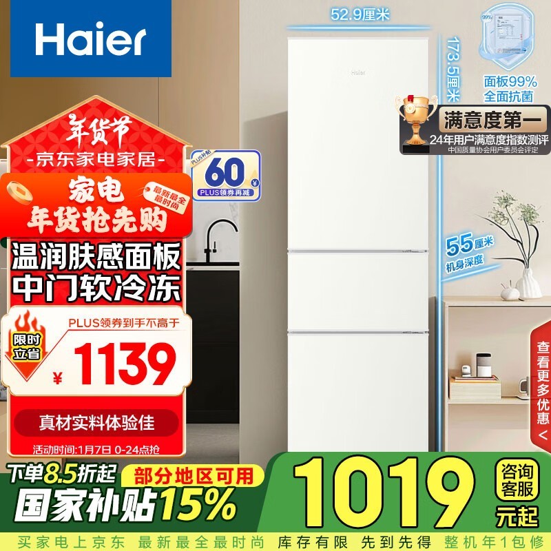 海尔 BCD-218LHC300GL三门冰箱,智能感应,直冷无霜,到手价1134元