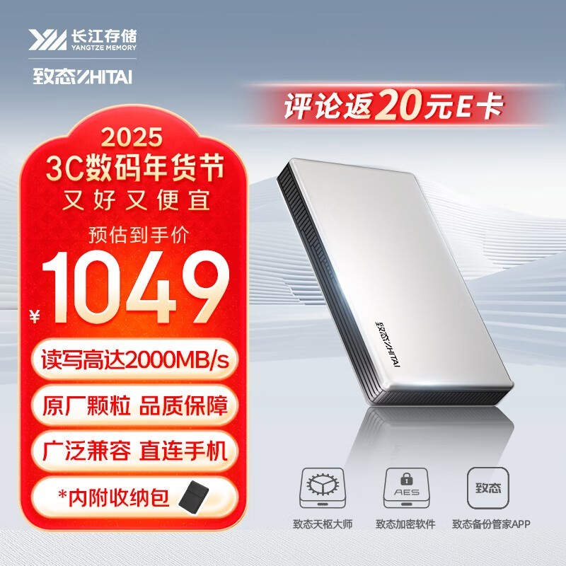 高性价比!致态长江存储 2TB Type-c USB 3.2 移动固态硬盘仅售989元