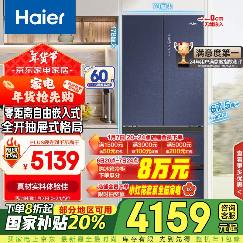 海尔 BCD-410WLHFD4DB1U1 风冷无霜冰箱 4159元到手