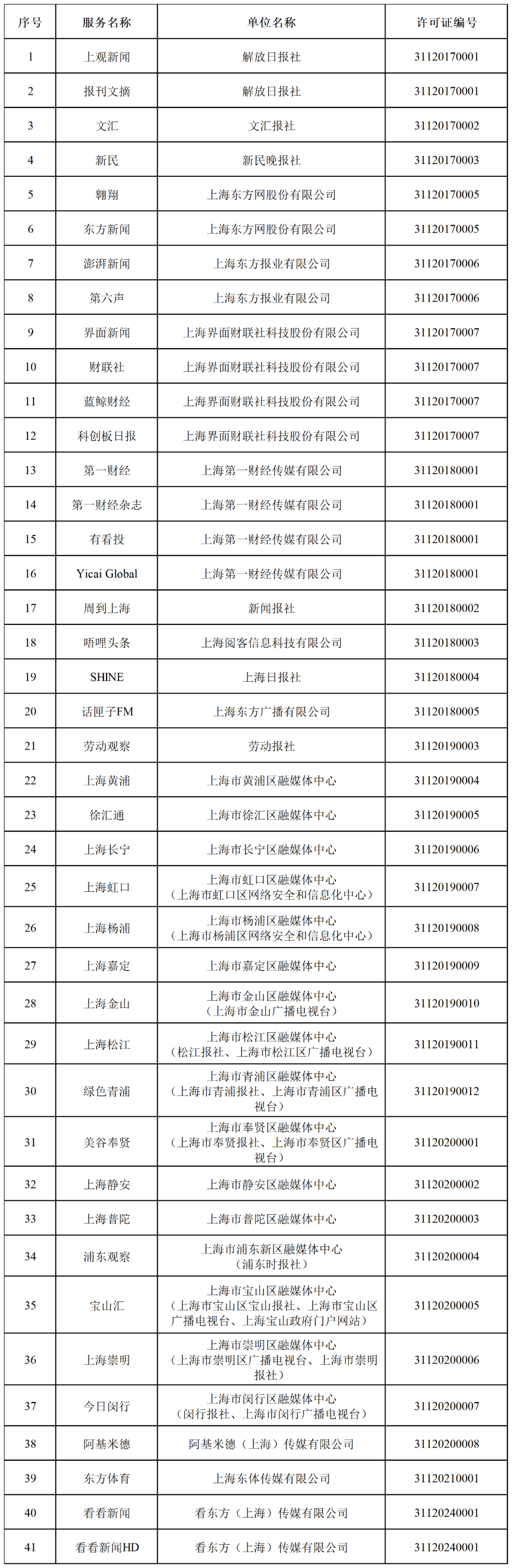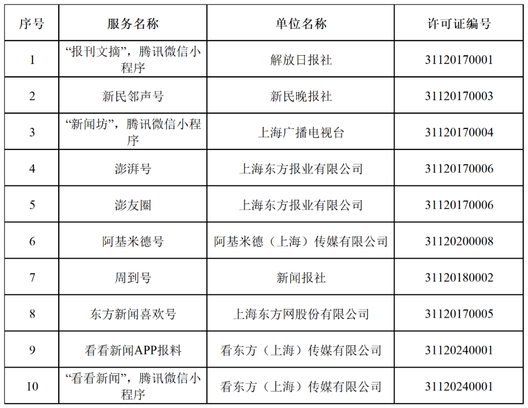 截至2024年12月31日,由上海市互联网信息办公室批准的互联网新闻信息服务单位共36家,分别是:解放日报社、文汇报社、新民晚报社、上海广播电视台、上海东方网股份有限公司、上海东方报业有限公司、上海界面财联社科技股份有限公司、上海第一财经传媒有限公司、新闻报社、上海阅客信息科技有限公司、上海日报社、上海东方广播有限公司、青年报社、上海法治报社、劳动报社、上海市黄浦区融媒体中心、上海市徐汇区融媒体中心、上海市长宁区融媒体中心、上海市虹口区融媒体中心(上海市虹口区网络安全和信息化中心)、上海市杨浦区融媒体中心(上海市杨浦区网络安全和信息化中心)、上海市嘉定区融媒体中心、上海市金山区融媒体中心(上海市金山广播电视台)、上海市松江区融媒体中心(松江报社、上海市松江区广播电视台)、上海市青浦区融媒体中心(上海市青浦报社、上海市青浦区广播电视台)、上海市奉贤区融媒体中心(上海市奉贤报社、上海市奉贤区广播电视台)、上海市静安区融媒体中心、上海市普陀区融媒体中心、上海市浦东新区融媒体中心(浦东时报社)、上海市宝山区融媒体中心(上海市宝山区宝山报社、上海市宝山区广播电视台、上海宝山政府门户网站)、上海市崇明区融媒体中心(上海市崇明区广播电视台、上海市崇明报社)、上海市闵行区融媒体中心(闵行报社、上海闵行广播电视台)、阿基米德(上海)传媒有限公司、上海东体传媒有限公司、五星体育传媒有限公司、上海科技报社、看东方(上海)传媒有限公司。