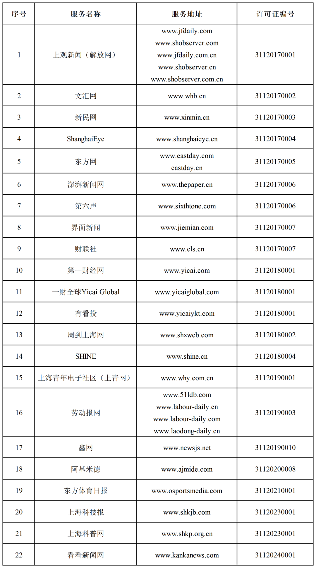 另,上海属地内的上海观察者信息技术有限公司、上海基分文化传播有限公司、上海大智慧信息科技有限公司由国家互联网信息办公室颁发《互联网新闻信息服务许可证》,准许其从事互联网新闻信息转载、传播平台服务。上海热线信息网络有限公司由国家互联网信息办公室颁发《互联网新闻信息服务许可证》,准许其从事互联网新闻信息转载服务。