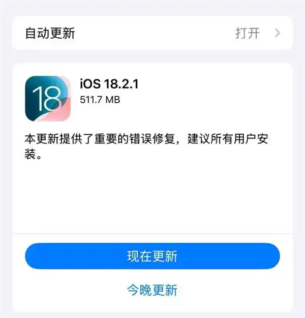 快科技1月7日消息,据报道,不少iPhone用户收到了苹果推送的iOS 18.2.1更新,本次更新未说明具体内容,只提到“本更新提供了重要的错误修复,建议所有用户安装”。