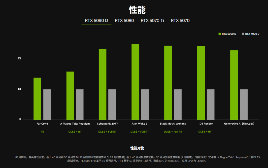 这个对比图细看之下还是有挺多门道的。NVIDIA比较厚道地列出了列出了几种不同的测试场景,而不是完全选用最有利于新显卡的游戏项目。右侧新旧提升最大的几款游戏应用,主要得益于50系显卡独占的DLSS4发挥了巨大作用。左侧提升最小的《孤岛惊魂6》,则不支持DLSS;提升稍小的《瘟疫传说:安魂曲》,则支持到DLSS 3。