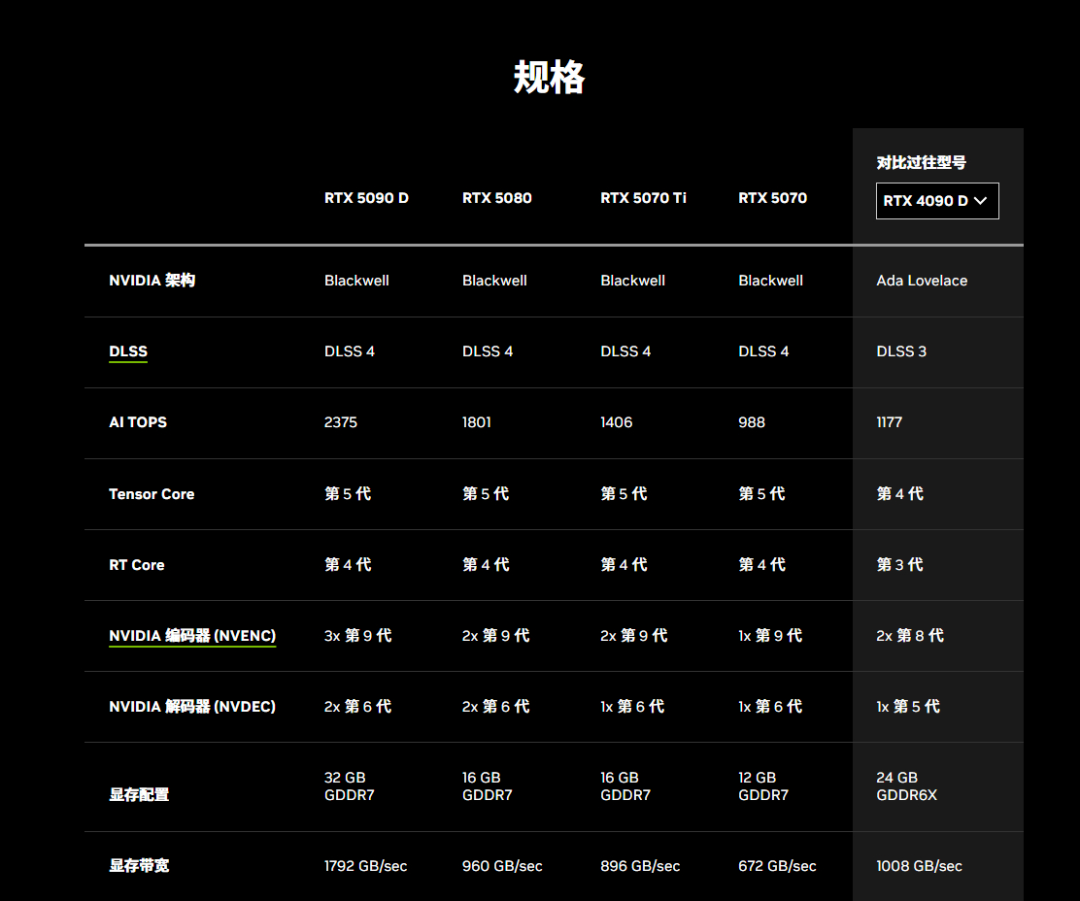 但既然老黄有信心在演讲中把5070和4090划等号,那么显然有额外的法宝,这个法宝便是DLSS4。从NVIDIA在官网上放出的性能规格对比图例,便可见一斑。