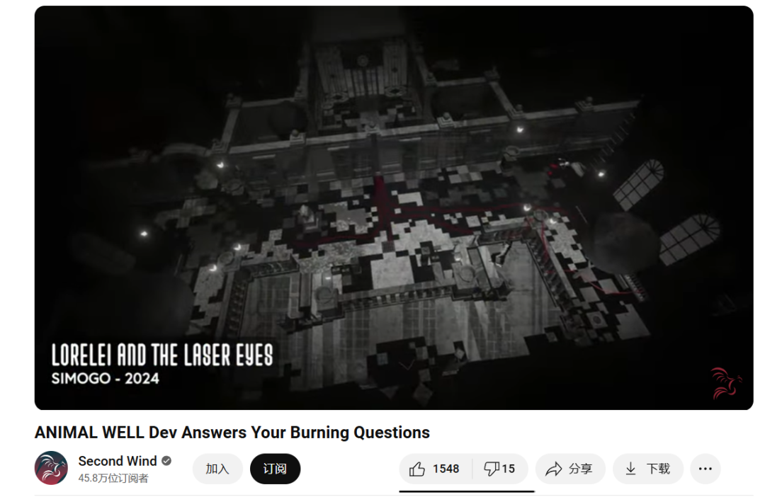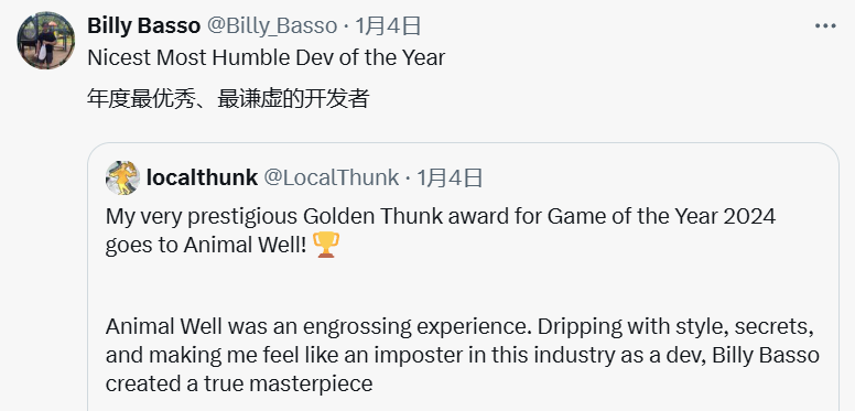 1月4日的时候,Localthunk专门搞了个Golden Thunk奖,没有媒体投票,也没有玩家评选,全凭Localthunk个人的口味和爱好,挑选6款来自2024年的优秀游戏。其中,《动物井》毫无悬念荣获Golden Thunk年度游戏,Localthunk表示:“《动物井》是一次引人入胜的游戏体验。它充满了风格和秘密,让我作为一名游戏开发者感到自己像个冒牌货(也有指‘冒名顶替综合征’之意),Billy Basso 打造了一部真正的杰作。”