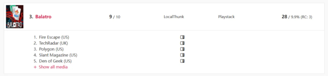 根据信息追踪网站GOTY Award Tracker统计的数据,截至2025年初,由Localthunk独立开发的《小丑牌》在全球各地的媒体评选活动中总计斩获了28个年度游戏奖项,成为去年获得该奖项数量第三多的作品,仅次于《宇宙机器人》与《最终幻想7:重生》。