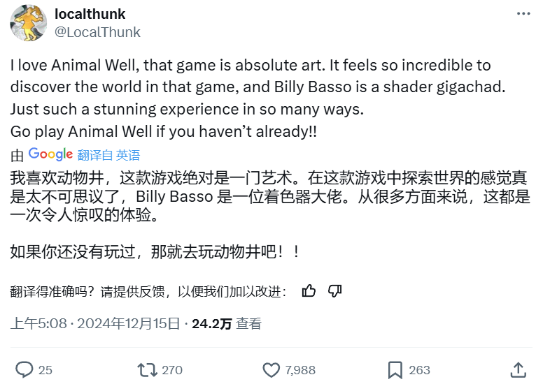其实《小丑牌》的开发者Localthunk也是这么想的。早在2024年TGA年度独立游戏提名公布之时,他就已经提前为《动物井》送上了祝福:“《动物井》是一款极其美妙的游戏,完全值得年度游戏的奖项”;当自己的游戏被评选为TGA年度独立游戏之后,Localthunk也在第一时间向大家安利了《动物井》: