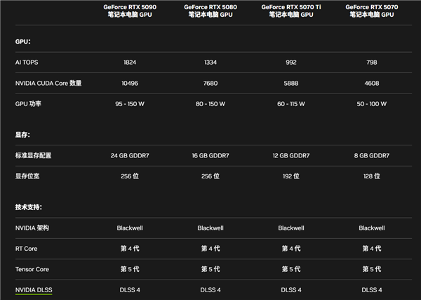 本次发布的移动版包括RTX 5090、RTX 5080、RTX 5070 Ti、RTX 5070,同样都基于Blackwell架构,都有第四代RT核心、第五代Tensor核心、DLSS 4。