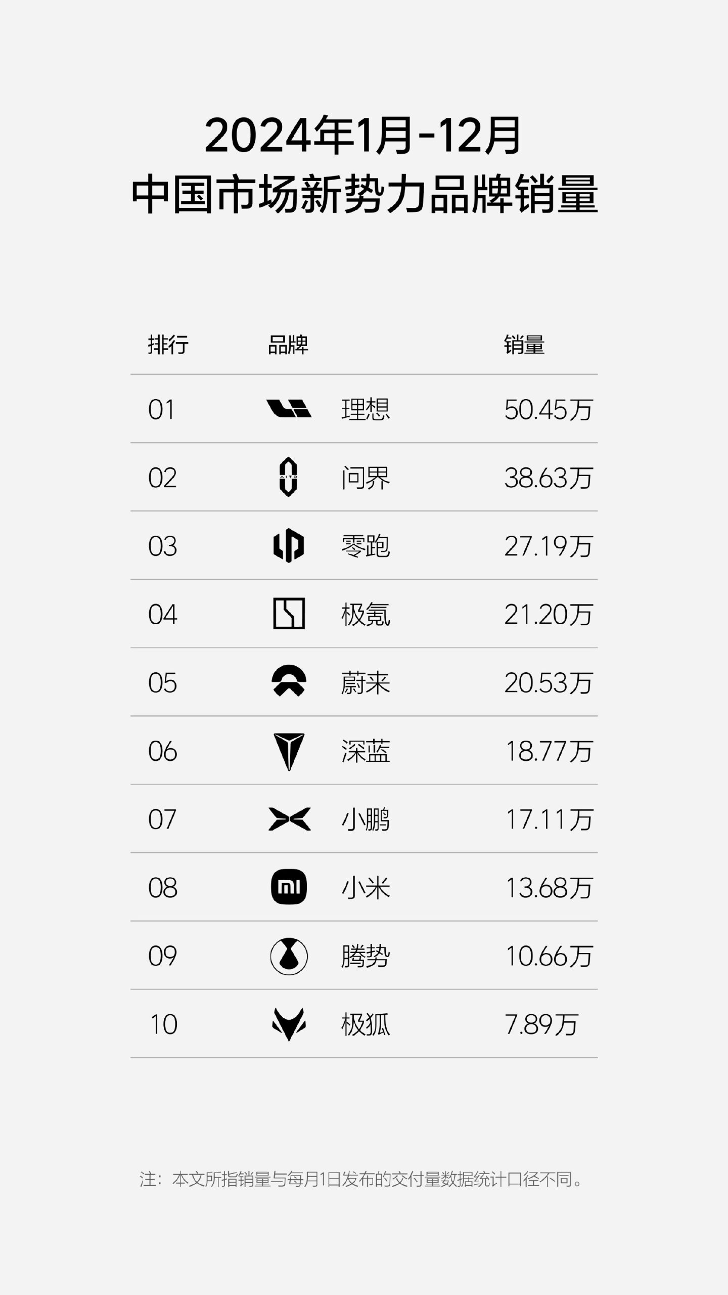 榜单显示,理想汽车2024年全年销量50.45万辆,超越问界、零跑等品牌,拿下中国新势力销冠称号。