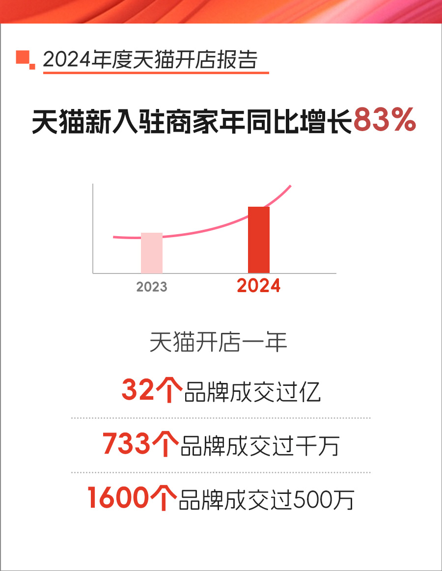 天猫发布了2024年度商家开店报告。报告显示,2024年天猫平台新入驻的商家数量同比增长了83%。在入驻天猫的一年内,有32个品牌实现了成交额破亿,733个品牌年成交额超过千万,而年成交额达到500万以上的品牌更是达到了1600个。