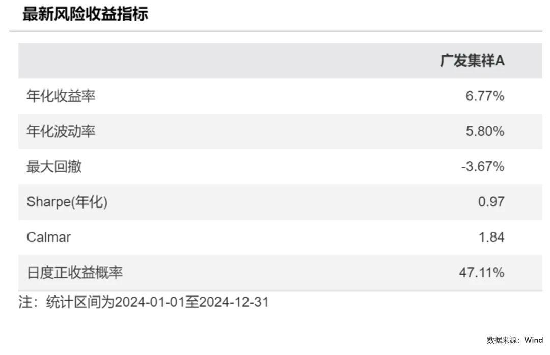 从近一年的风险收益指标看,广发集祥在5.8%的年化波动率的基础上,实现了6.77%的年化收益率,夏普比率达到0.97,卡玛比率为1.84,风险收益比较高。