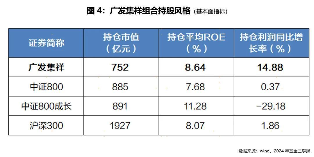 根据广发集祥2024年三季报披露的持仓,我们可以计算得出,持仓股票平均市值为752亿元,持仓ROE为8.64%,整体呈现出中盘、价值成长风格。