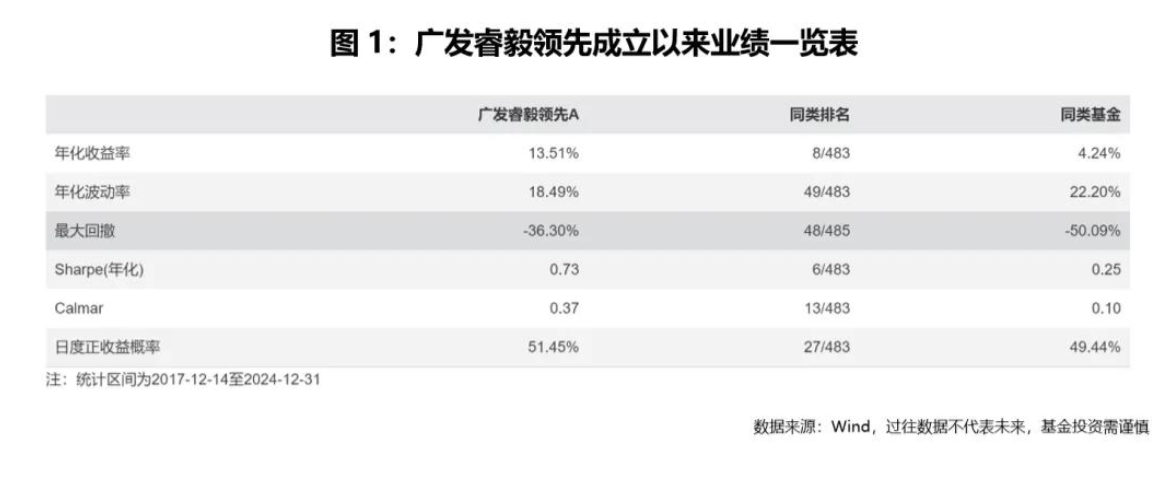 以林英睿管理的首只新发基金广发睿毅领先为例,该基金成立于2017年12月14日,截至2024年年底,市场经过了完整的牛熊周期转换,沪深300指数区间下跌2.84%,而广发睿毅领先在7年的时间里实现了144.49%的回报,年化回报达13.51%。