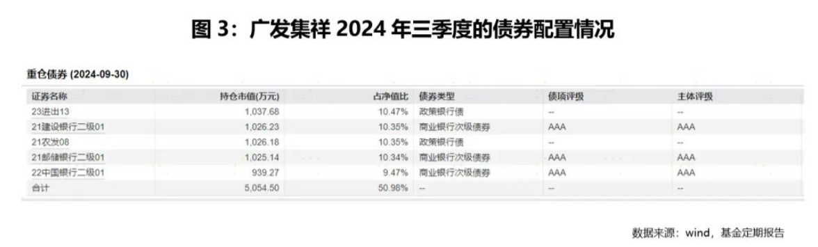 如下表所示,广发集祥的重仓债券主要是政策银行债和商业银行次级债券,主体评级是AAA。